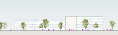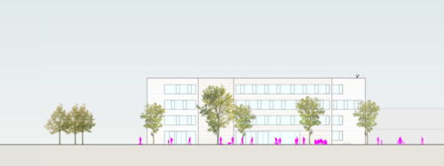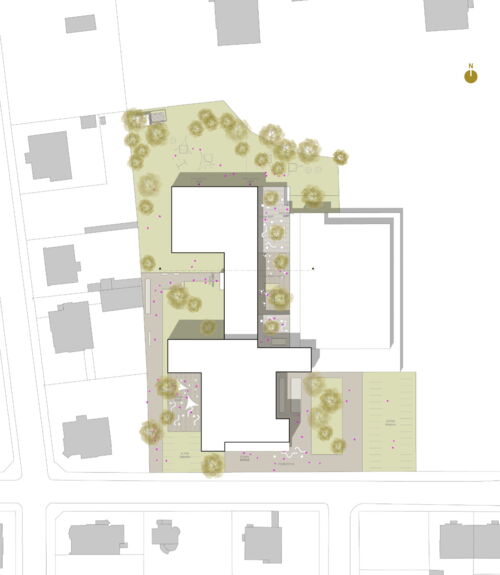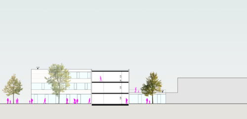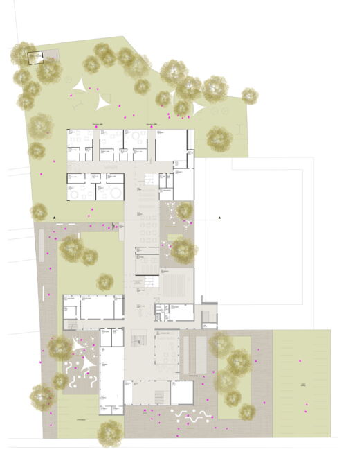 Der neue Baukörper erlaubt durch seine Gestaltung die Entwicklung von offenen, lichtdurchfluteten Innenräumen und profitiert von der unmittelbaren Anbindung an das Bestandsgebäude und dessen eigene Erschließung unter Berücksichtigung der erforderlichen Funktionstrennung. Der neu organisierte Zugang im Bestand als auch die Zugänge zu Kindergarten und Hort werden als großzügige Entrees mit differenzierten Pausenzonen gestaltet und profitieren von den konzipierten Plätzen und Aufenthaltsbereichen in den Freiflächen.