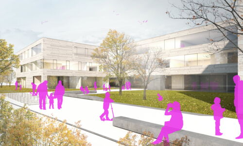 Die Verdichtung auf der bestehenden Liegenschaft der Bundes-Bildungsanstalt erfolgt durch einen winkelförmigen Zubau entlang der angrenzenden Veranstaltungshalle, der durch die geschaffenen Terrassenlandschaften und eine präzise Anbindung geprägt ist.